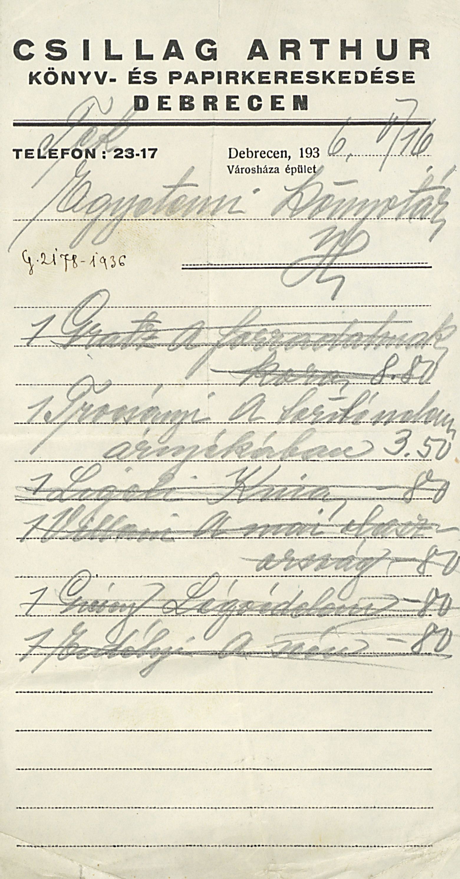 Csillag Arthur Könyv- és Papírkereskedése Debrecen...