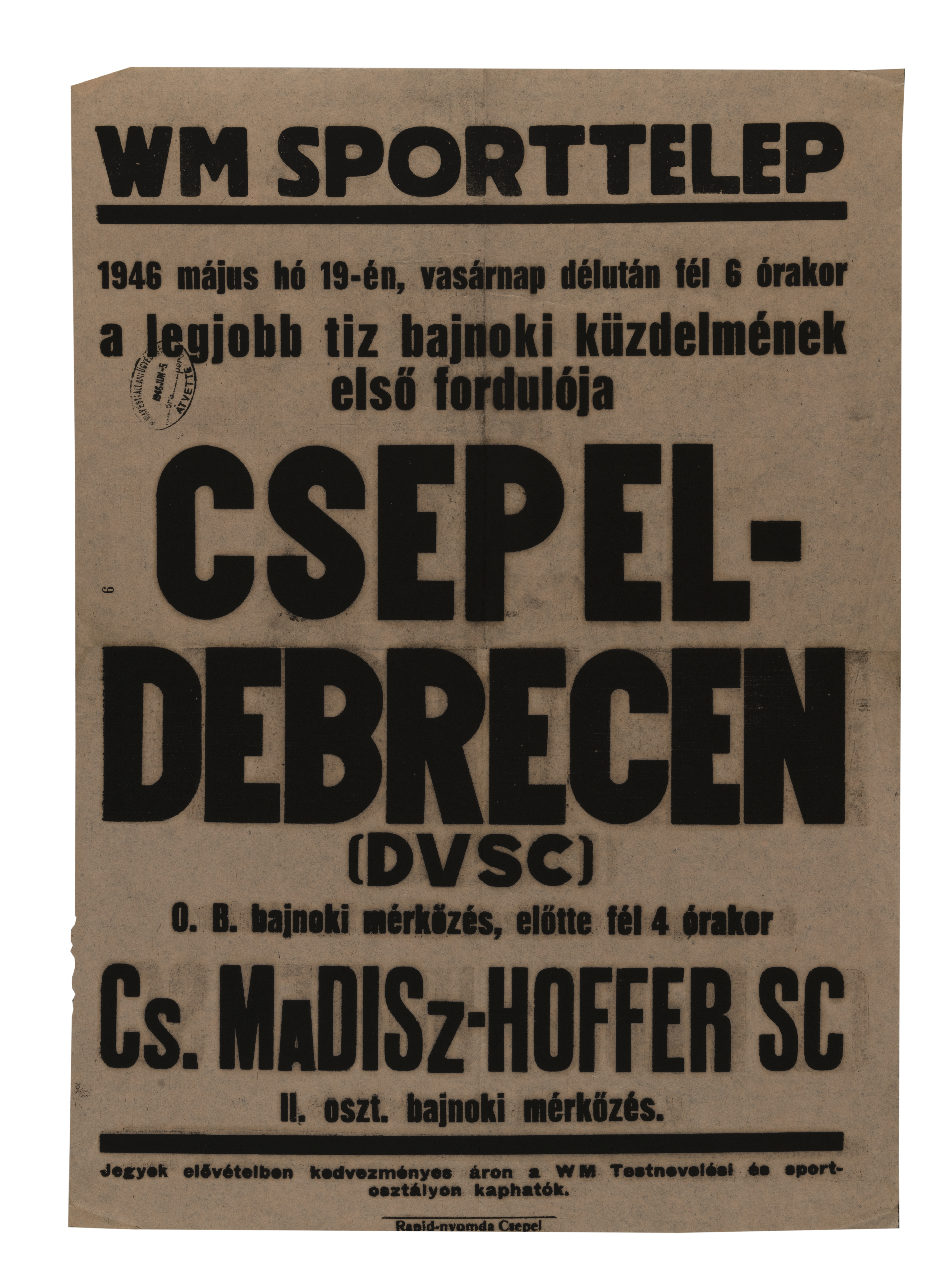 WM Sporttelep 1946 május hó 19-én, vasárnap ... a legjobb tiz bajnoki küzdelmének első fordulója Csepel-Debrecen (DVSC)