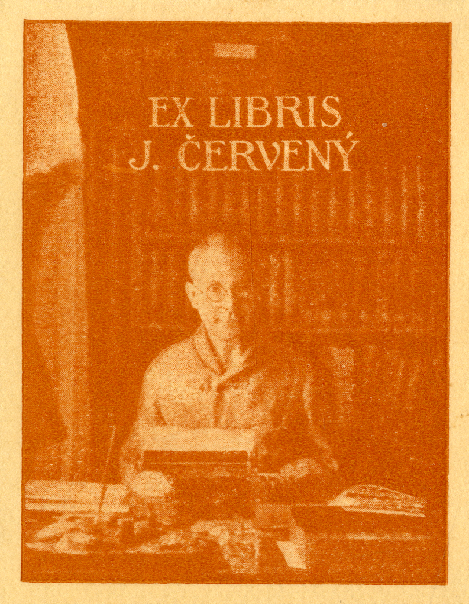 | dc.description.image | Írógépénél ülő szemüveges férfi (valószínűleg az ex libris tulajdonosa) szemből, mögötte teli könyvszekrény. Fénykép. Felirat felette: Ex libris J. Červený. | en |