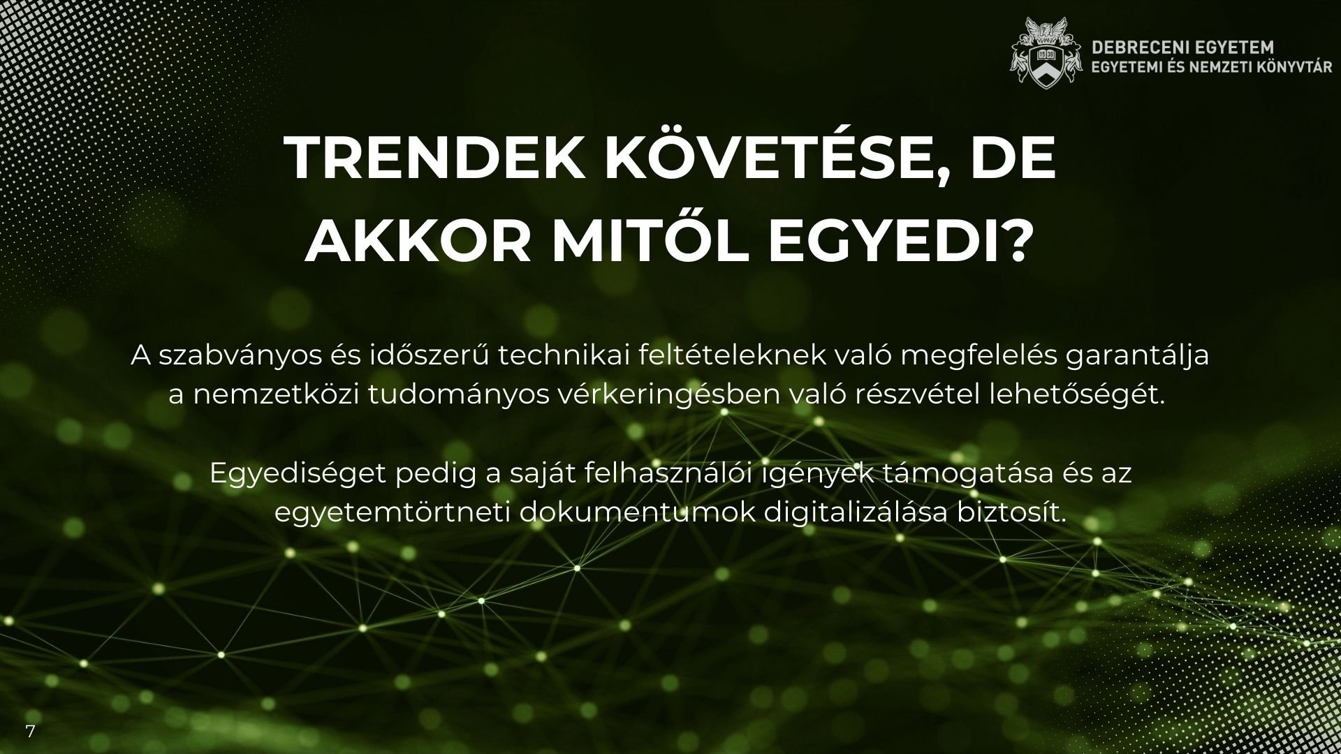 A DEENK 2006-ban elsőként indította el intézményi repozitóriumát, a DEA-t. Az azóta eltelt csaknem két évtizedben a DSpace alapú archívum az egyetemi tudásvagyon megőrzésének alapvető eleme, s az open science egyik zászlóshajója lett. Az újonnan megjelenő dokumentum formátumok, a DSpace rendszer bővülő funkciói és a felhasználói igények állandó változása e digitális "raktár" esetében is elengedhetetlenné teszik a rendszeres felülvizsgálatot. A DEENK két éve egy átfogó reorganizációs projektet indított azzal a céllal, hogy a DEA-t és annak működését minden tekintetben hozzáigazítsa a jelen már létező elvárásaihoz és felkészítse a jövő már látható kihívásaira. A projekt többek között a DSpace hierarchiájára, digitalizált állomány struktúrjának kialakítására, a tételek metaadat szintű logikai összekapcsolására és virtuális kiállítások megalapozására koncentrál, de hatása a teljes dokumentum-feldolgozási folyamatot és a fizikai raktárak kapacitás-gazdálkodását sem hagyja érintetlenül. Fizikai állományunk láthatóvá tétele mellett a gyarapodó elektronikus állományunk hosszú távú megőrzése, avagy raktározása is kiemelt jelentőségű, így az előadás nem utolsó sorban betekintést nyújt a Podcast archiválásba a DSpace entitás keretrendszerén keresztül.