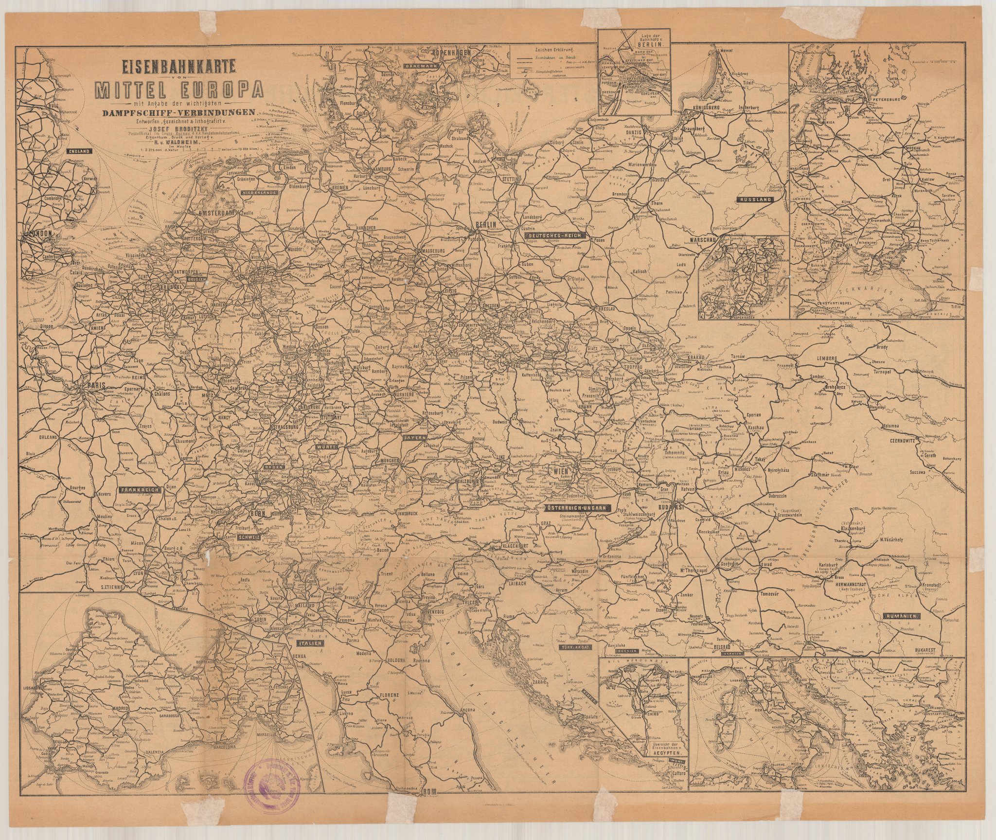 Eisenbahnkarte von Mittel Europa mit Angabe der wichtigsten Dapfschiff-Verbindungen