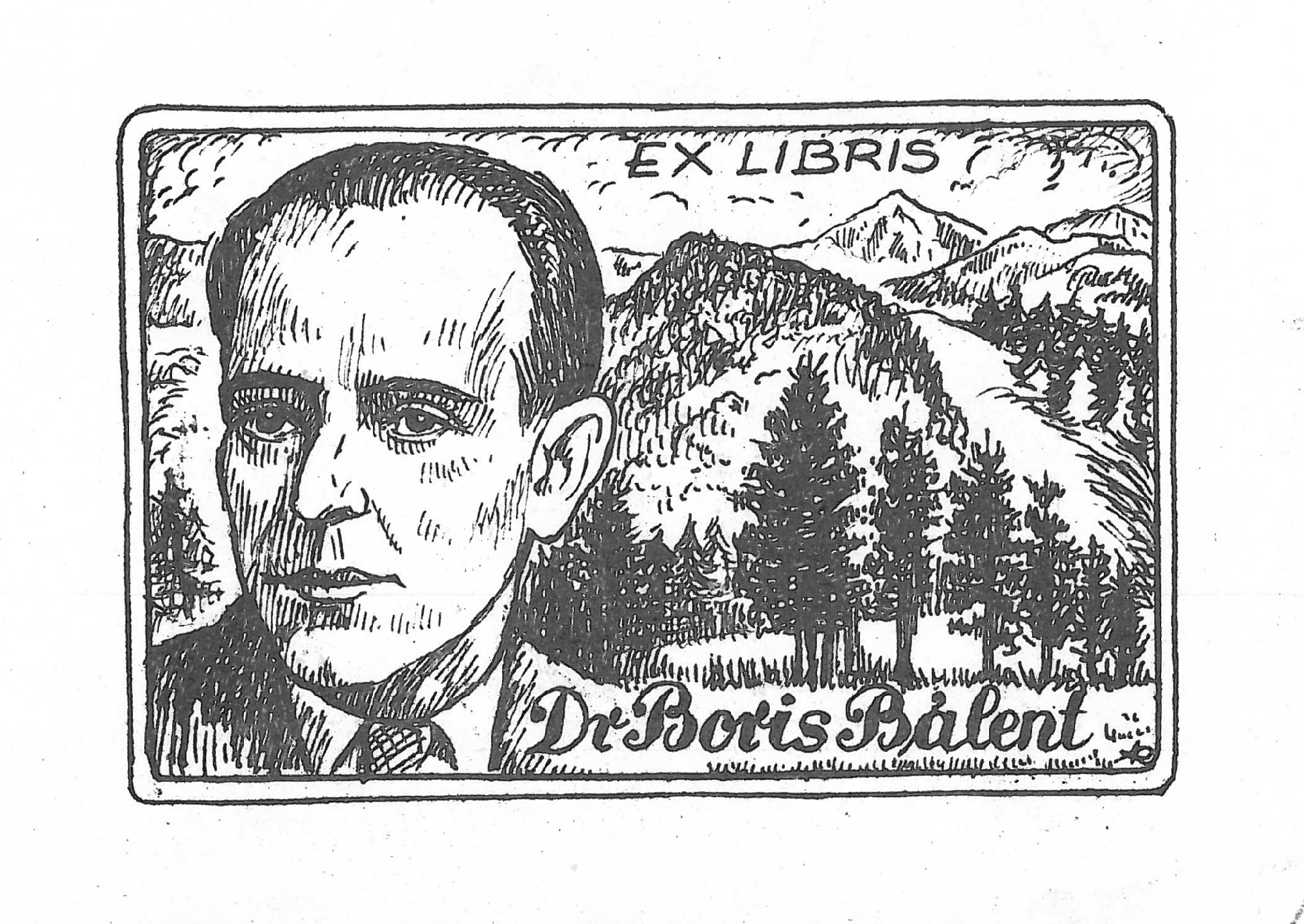 | dc.description.image | Hegyvidéki tájkép jobbra a háttérben, az előtérben balra az ex libris tulajdonosának arcképe. Felül és alul felirat: Ex libris Dr. Boris Bálent. A készítő monogramja a jobb alsó sarokban. | en |