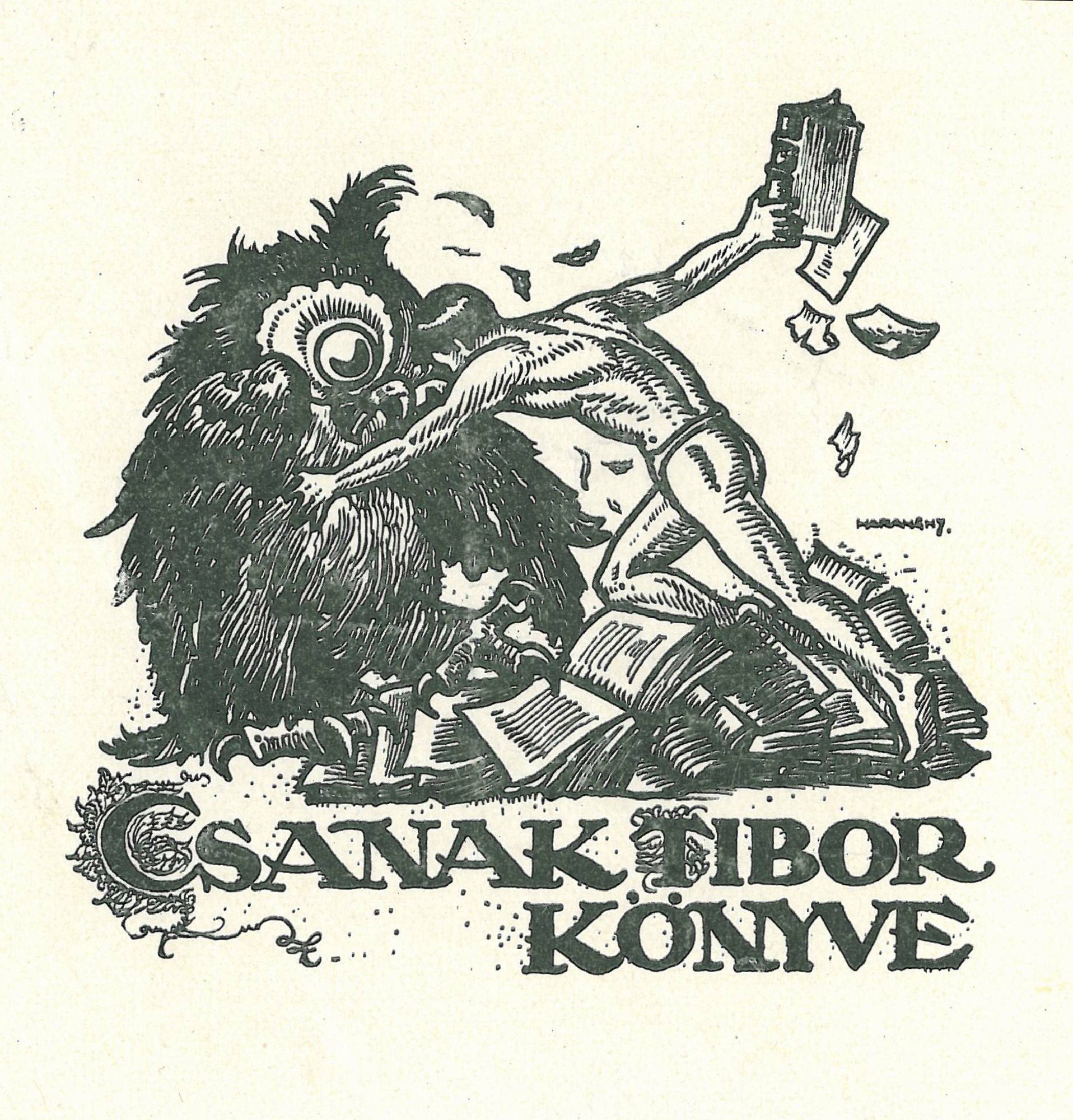 | dc.description.image | Földön heverő széttépett könyvek fölött hatalmas bagollyal küzdő meztelen férfi, jobbjában egy sérült könyv. Alul felirat: Csanak Tibor könyve. A hátoldalon kézírással olvasható: "Haranghy 1930". | en |