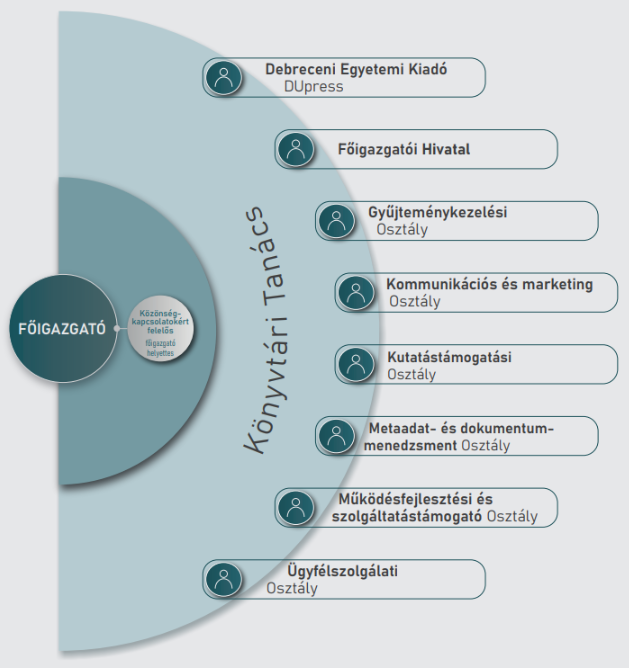 A Debreceni Egyetem Egyetemi és Nemzeti Könyvtár szervezeti felépítése 2025-től.