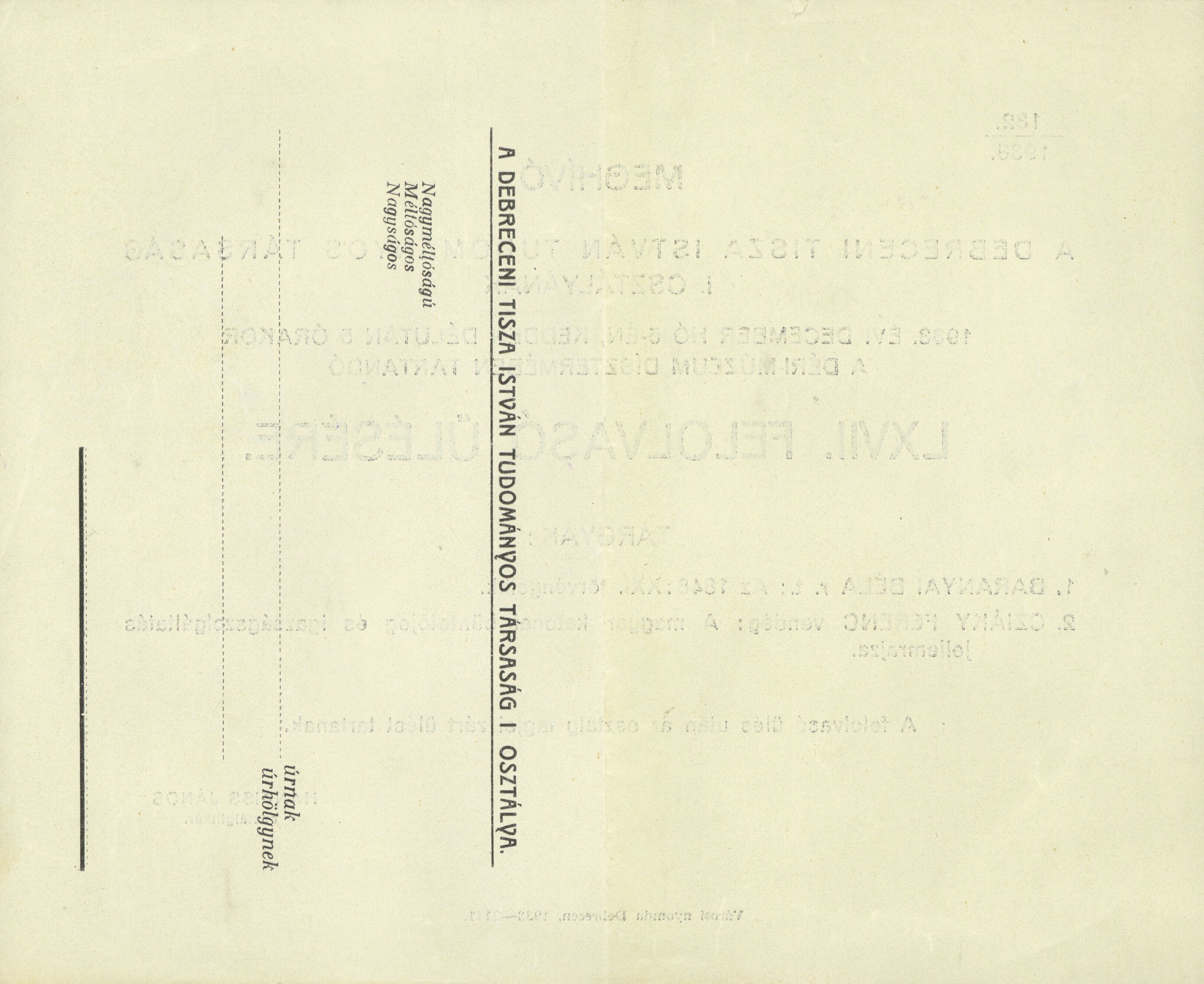 Meghívó a Debreceni Tisza István Tudományos Társaság I. Osztályának 1933. évi december hó 5-én... a Déri-Múzeum Dísztermében tartandó LXVII. felolvasó ülésre...