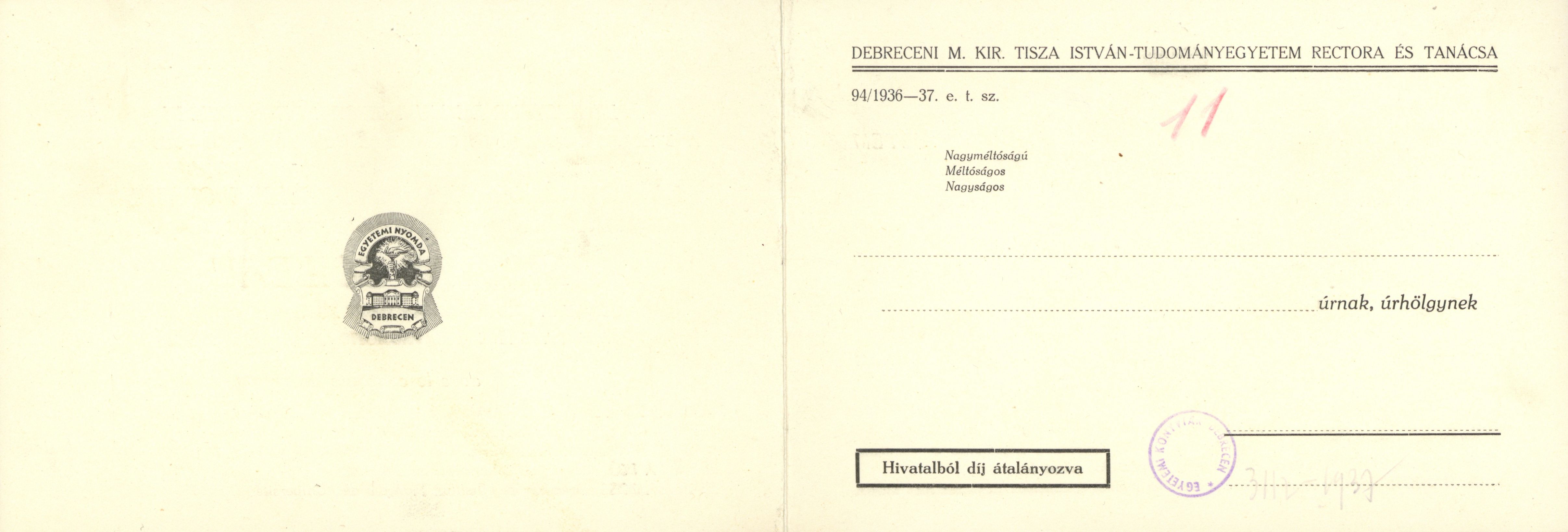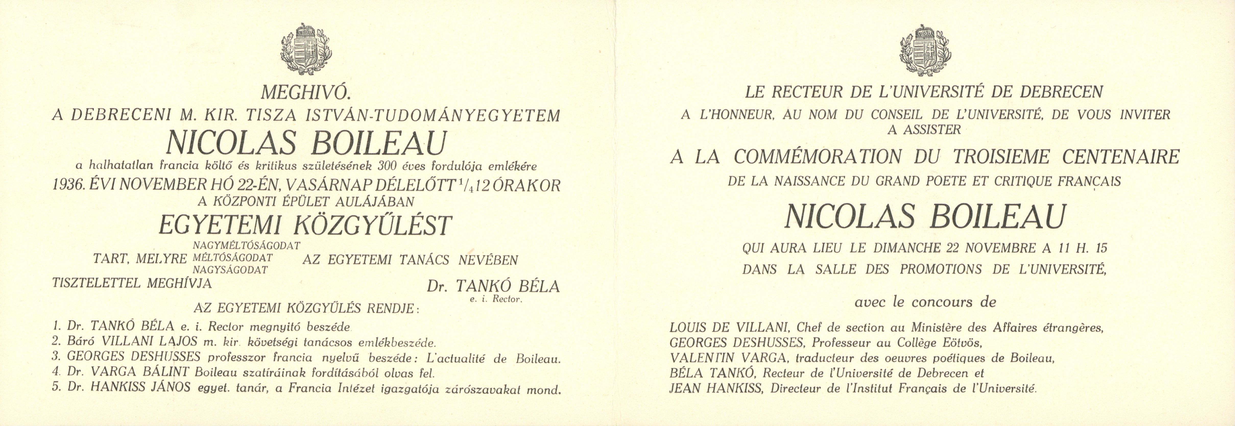 A Debreceni M. Kir. Tisza István - Tudományegyetem Nicolas Boileau... emlékére... egyetemi közgyűlést tart...