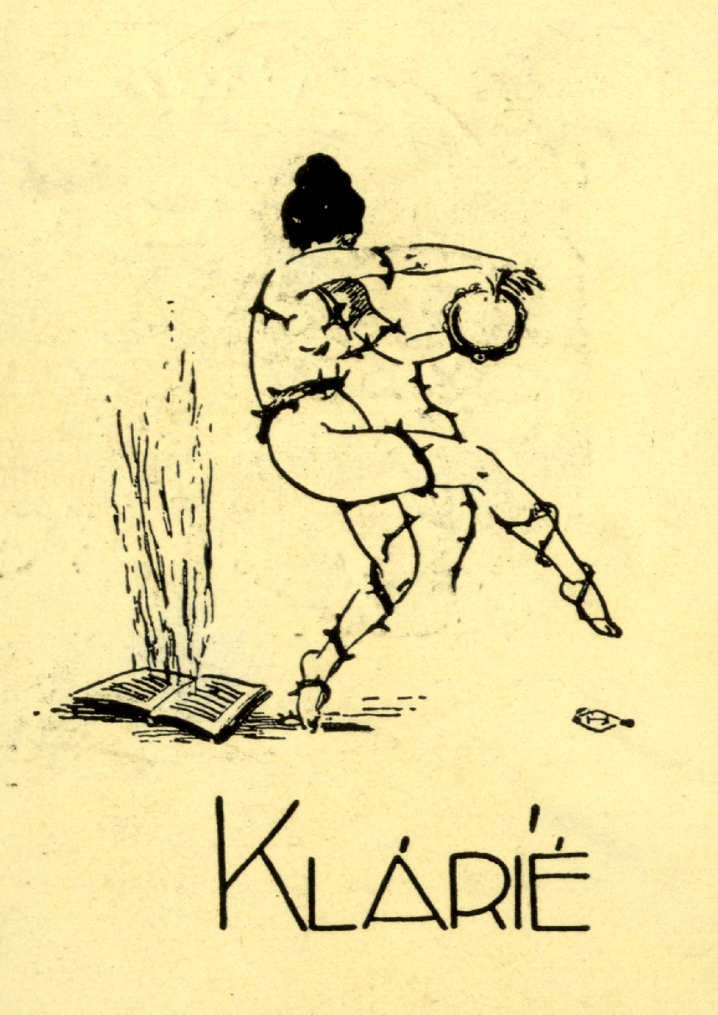 | dc.description.image | Kezében csörgődobbal táncoló, tövises indákkal körülfont testű meztelen táncosnő, tőle balra nyitott könyv, melyből lángoszlop tör fel. Alul felirat: Klárié. | en |