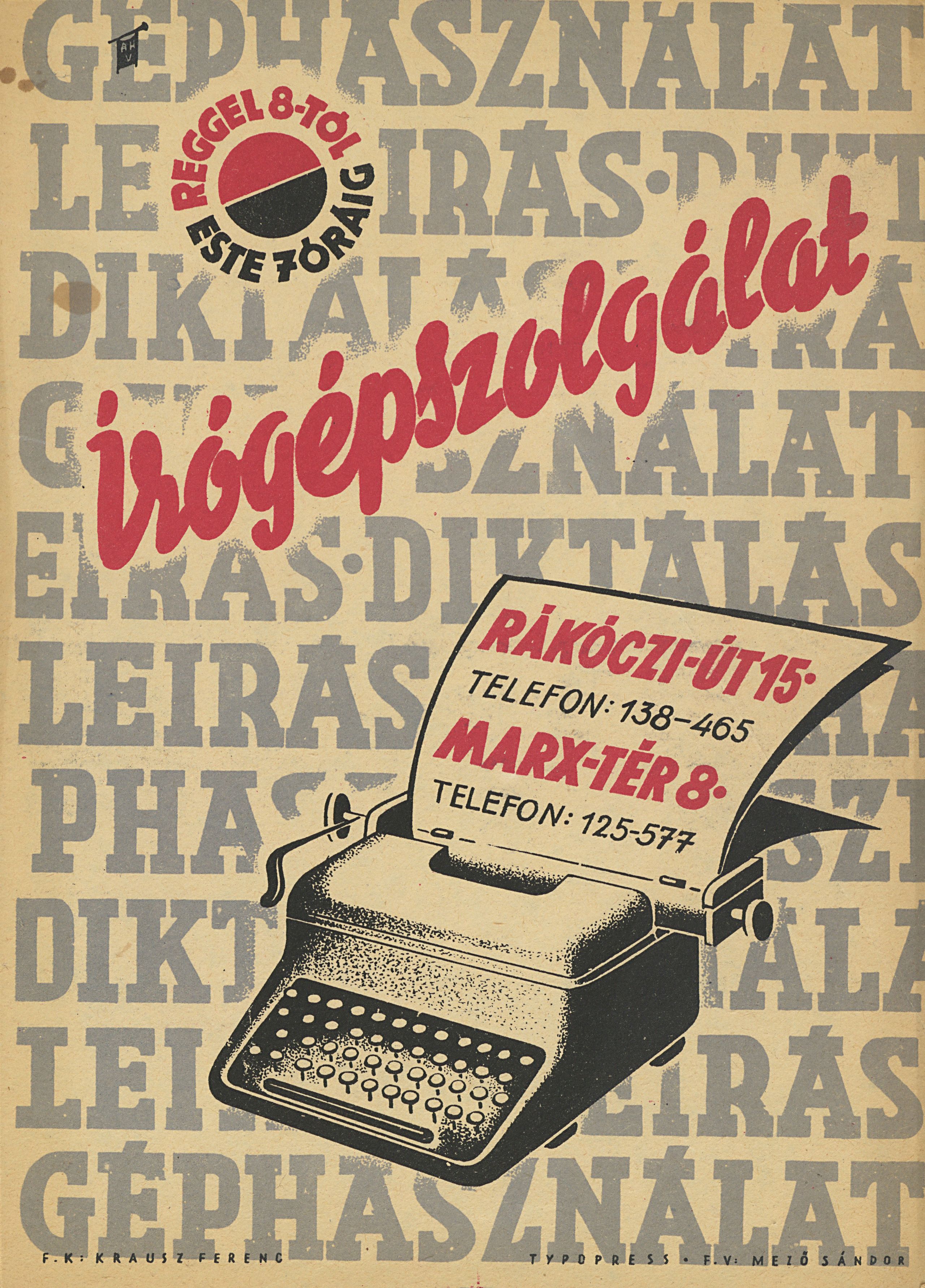 | dc.title.subtitle | Reggel 8-tól este 7 óráig Rákóczi-út. 15. Telefon: 138-465 Marx-tér 8. Telefon: 125-577 | hu_HU |