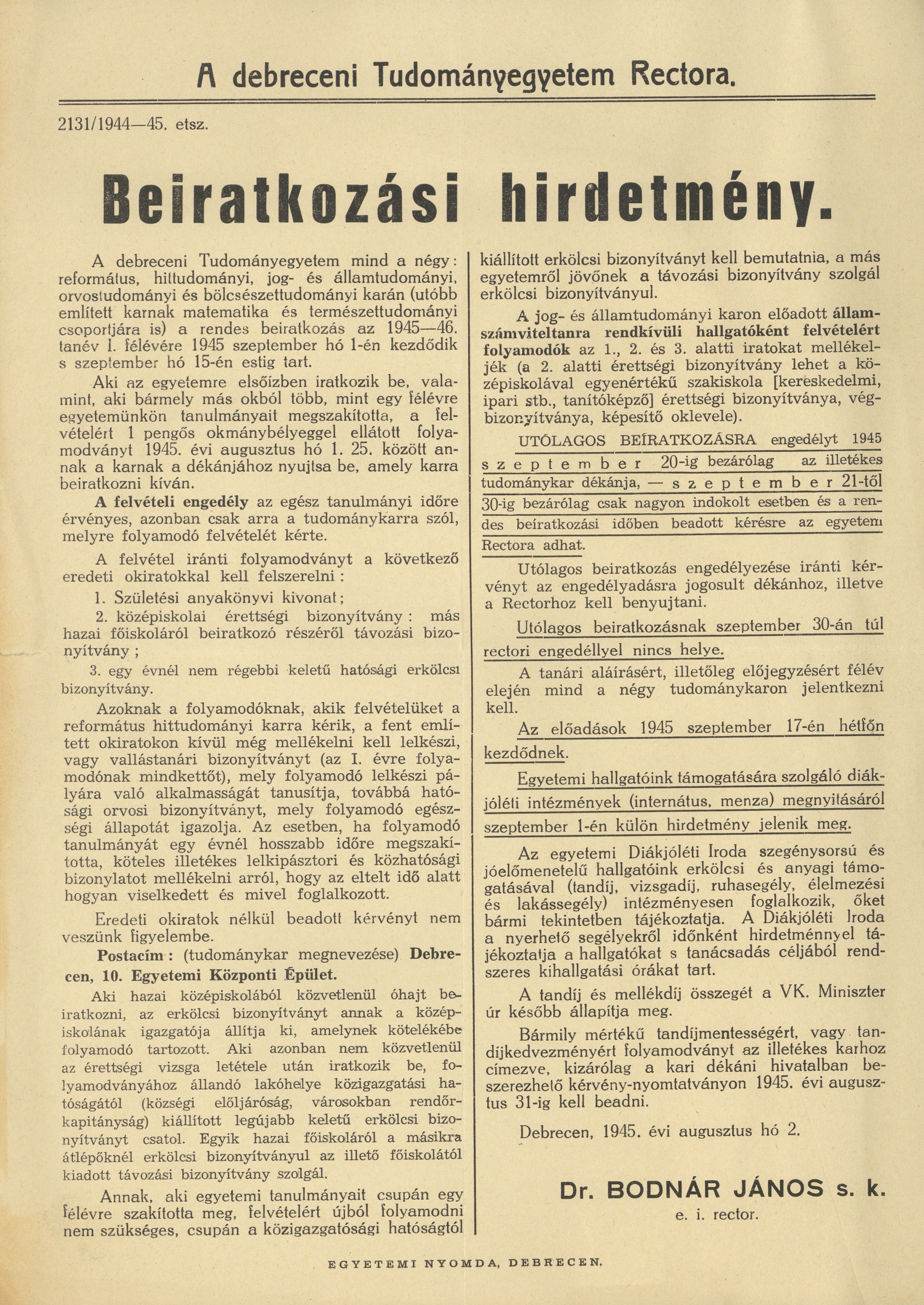A debreceni Tudományegyetem Rectora. Beiratkozási hirdetmény...