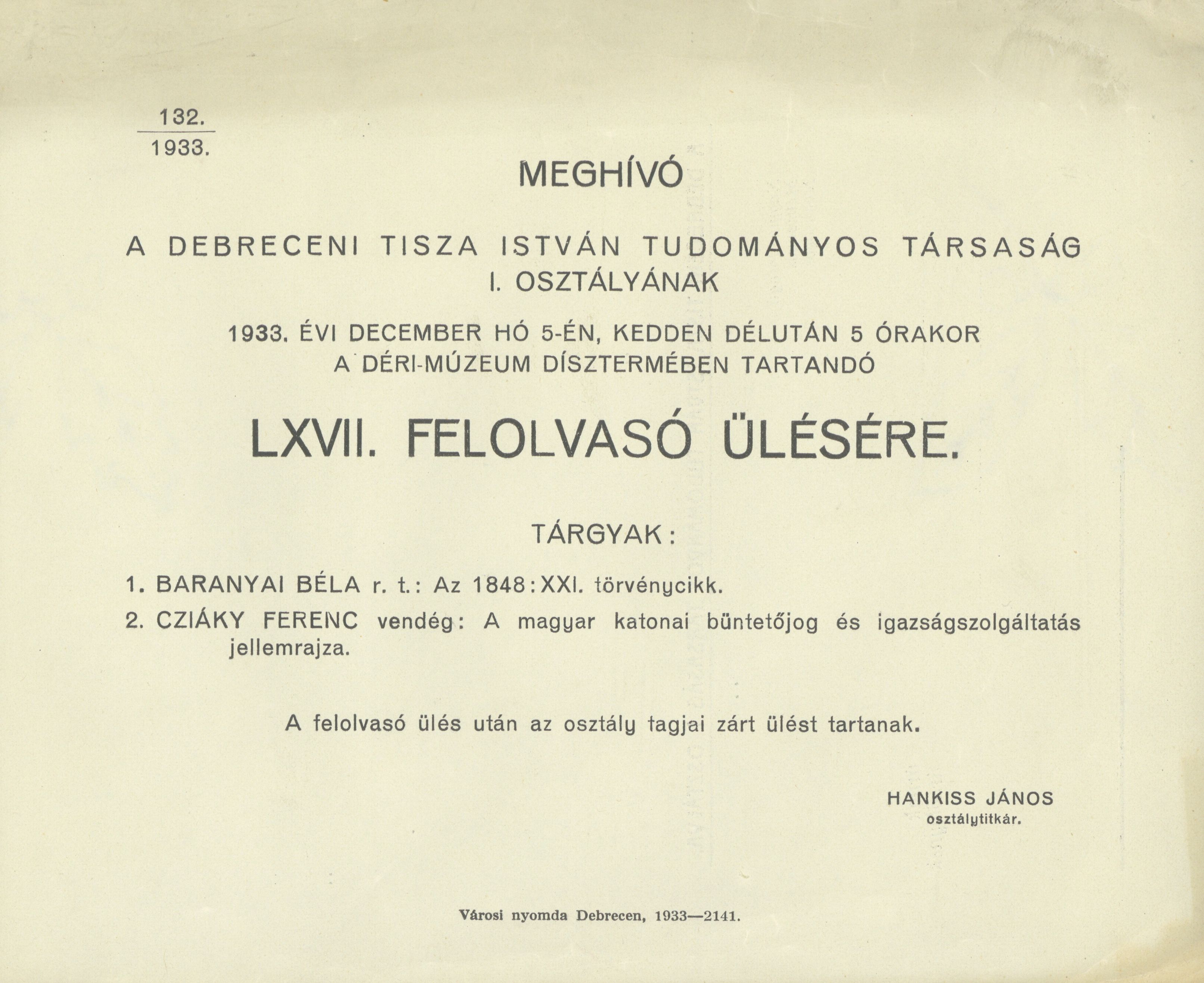 Meghívó a Debreceni Tisza István Tudományos Társaság I. Osztályának 1933. évi december hó 5-én... a Déri-Múzeum Dísztermében tartandó LXVII. felolvasó ülésre...