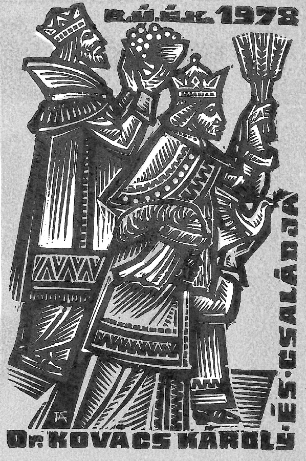 | dc.description.image | A Háromkirályok érkezése, kezükben szőlő, búzakalász és olajágat tartó galamb ("Bort, búzát, békességet!"). Felül és alul felirat: "B.Ú.É.K. 1978 Dr. Kovács Károly és családja". Világoskék háttéren. A készítő monogramja a legalul elhelyezkedő király ruhájának csücskén látszik. A teljes neve a lap alján van ceruzával feljegyezve. | en |