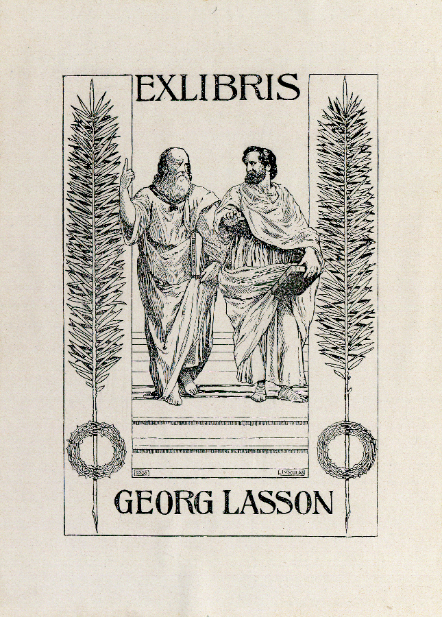 | dc.description.image | Az ex librisen Raffaello Az athéni iskola című festménye részletének metszetes reprodukciója látható: Platón felmutat az ideák égi birodalma felé, Arisztotelész ellenben lefelé mutat a földi létezőket hangsúlyozva. Kétoldalt egy-egy dísznövény-ág, szárukon koszorúval. A képen a következő feliratok olvashatóak: Ex libris Georg Lasson, 1908 J.V. Kulas | hu_HU |