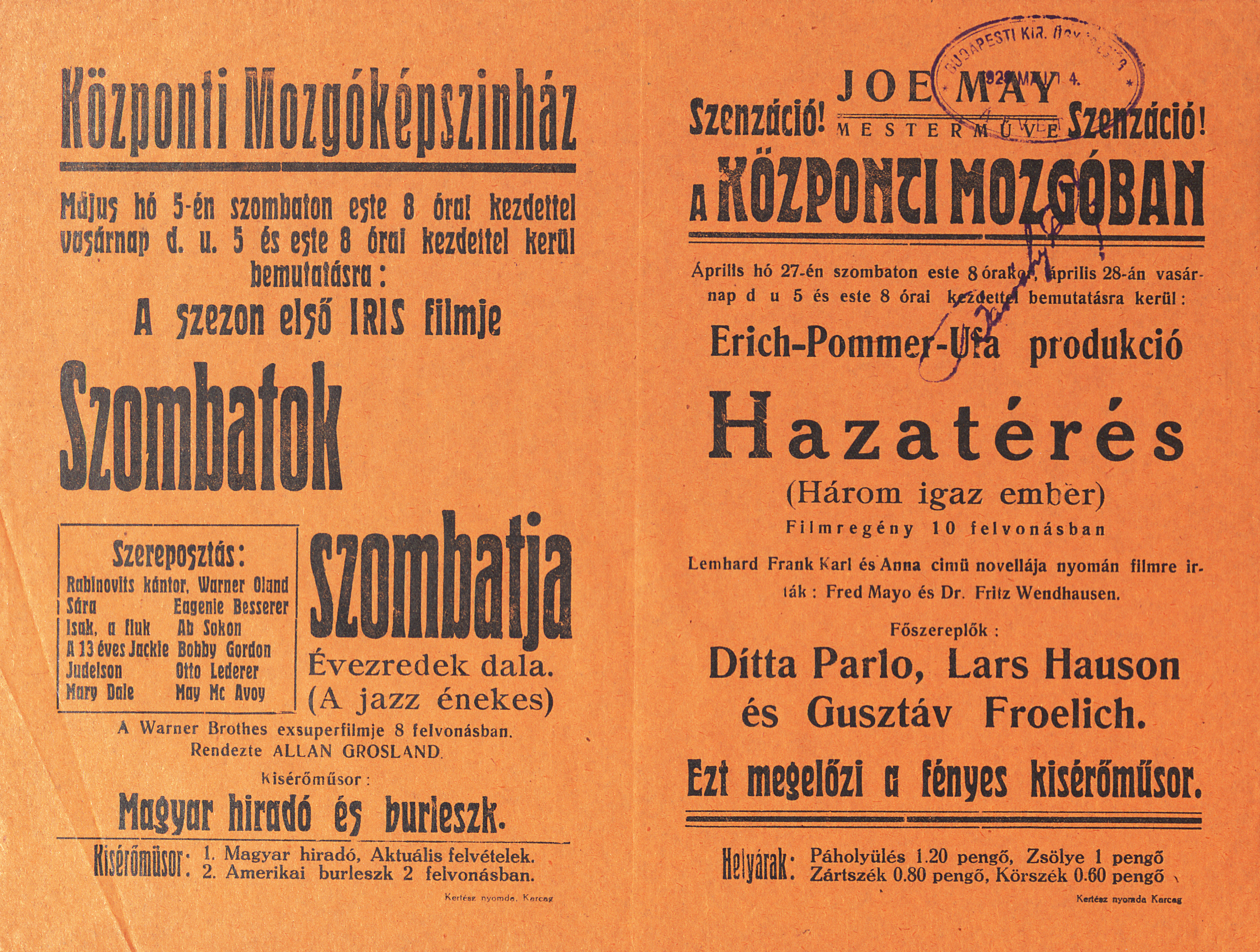 Galéria::Plakátok::Művészetek::Film::Moziműsor, Központi Mozgóképszínház (Karcag), Universum Film AG (Berlin), May, Joe (1880-1954) (filmrendező, filmproducer), Pommer, Erich (1889-1966) (filmproducer), Frank, Leonhard (1882-1961) (író), Mayo, Fred, Wendhausen, Fritz (1891-1962) (filmrendező, forgatókönyvíró), Parlo, Dita (1906-1971) (filmszínésznő), Hauson, Lars (1886-1965) (színész), Fröhlich, Gustav (1902-1987) (színész)