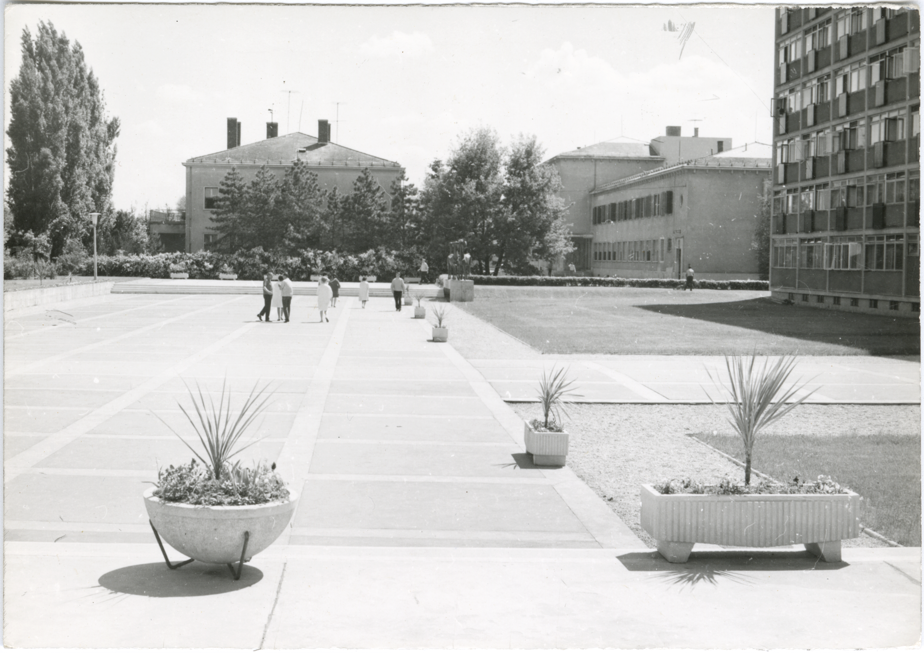 Főiskola előtere, diákokkal és dísznövényekkel II., 1967