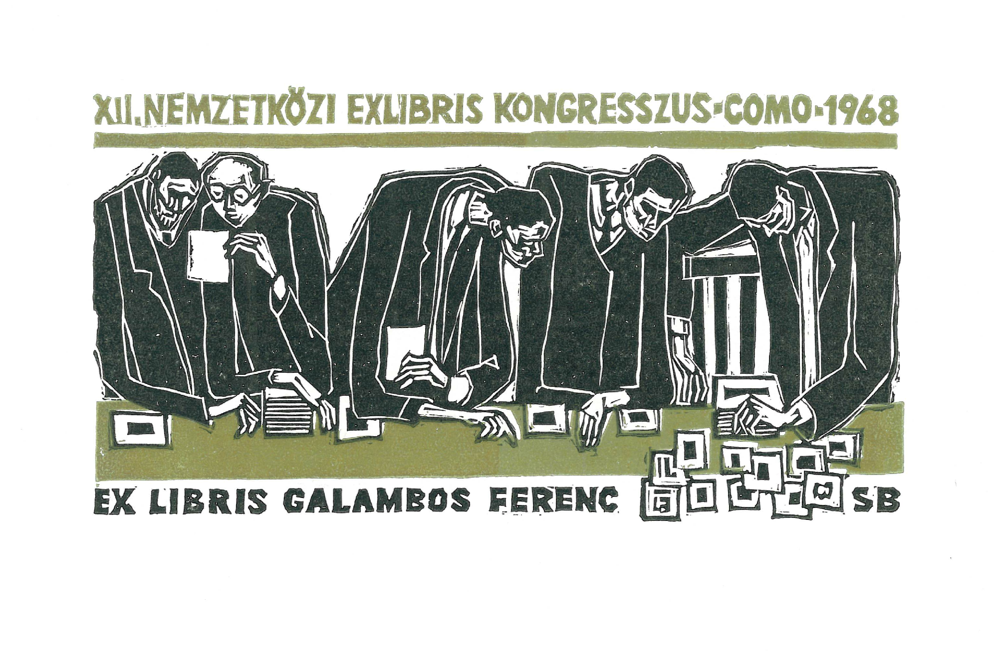 | dc.description.image | A képen öt férfialak látható, amint egy asztal fölé görnyedve ex libriseket vesznek alaposan szemügyre. Az asztal és a felső felirat arany színű, a kép további részei fekete-fehérek. Felül és alul felirat: XII. Nemzetközi Exlibris Kongresszus Como 1968 Ex libris Galambos Ferenc. | en |