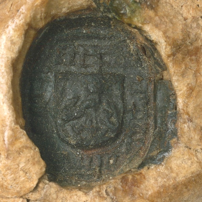 Természetes színű pecsétfészek benne nyolcszög alakú gyűrűspecsét zöld viaszban. A pecsétmező közepén álló, kerek talpú címerpajzs, benne elmosódott címerábra. A pajzs körül elmosódott körirat. (CSH_00123)