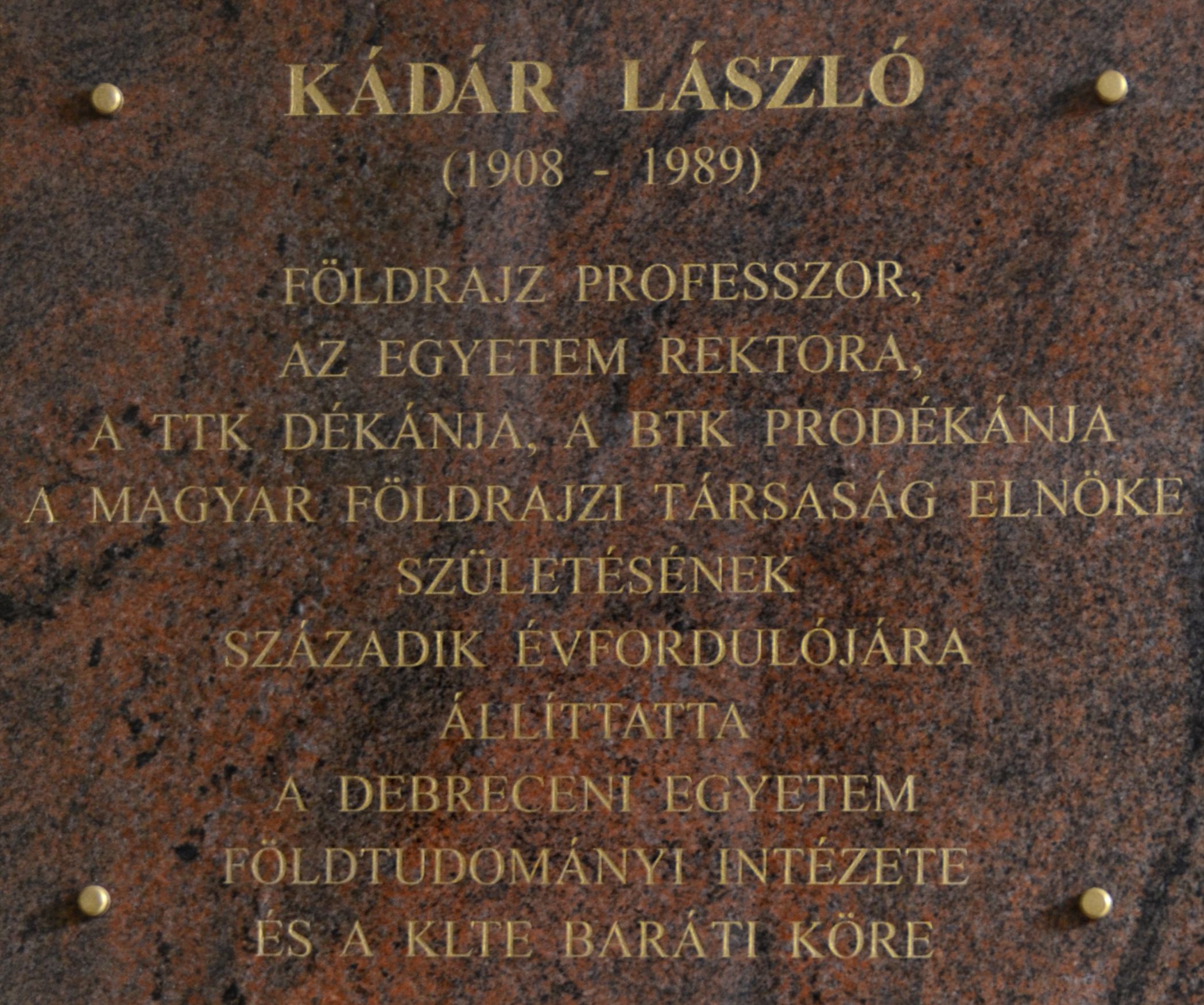 | dc.description.image | Az emléktáblán a következő felirat olvasható: Kádár László (1908-1989) Földrajz professzor, az Egyetem rektora, a TTK dékánja, a BTK prodékánja, a Magyar Földrajzi Társaság elnöke. Születése századik évfordulójára állíttatta a Debreceni Egyetem Földtudományi Intézete és a KLTE Baráti Köre. | hu_HU |