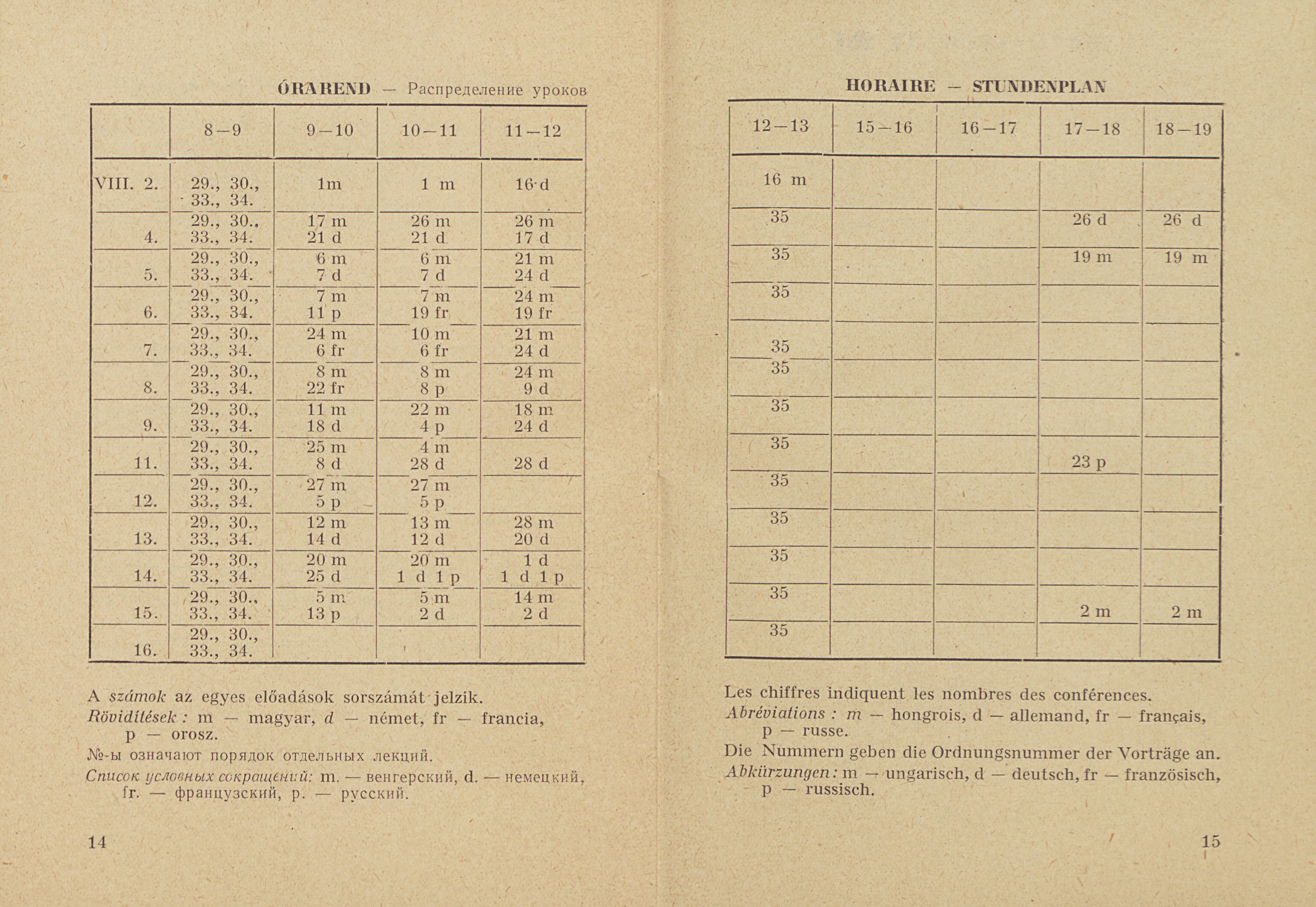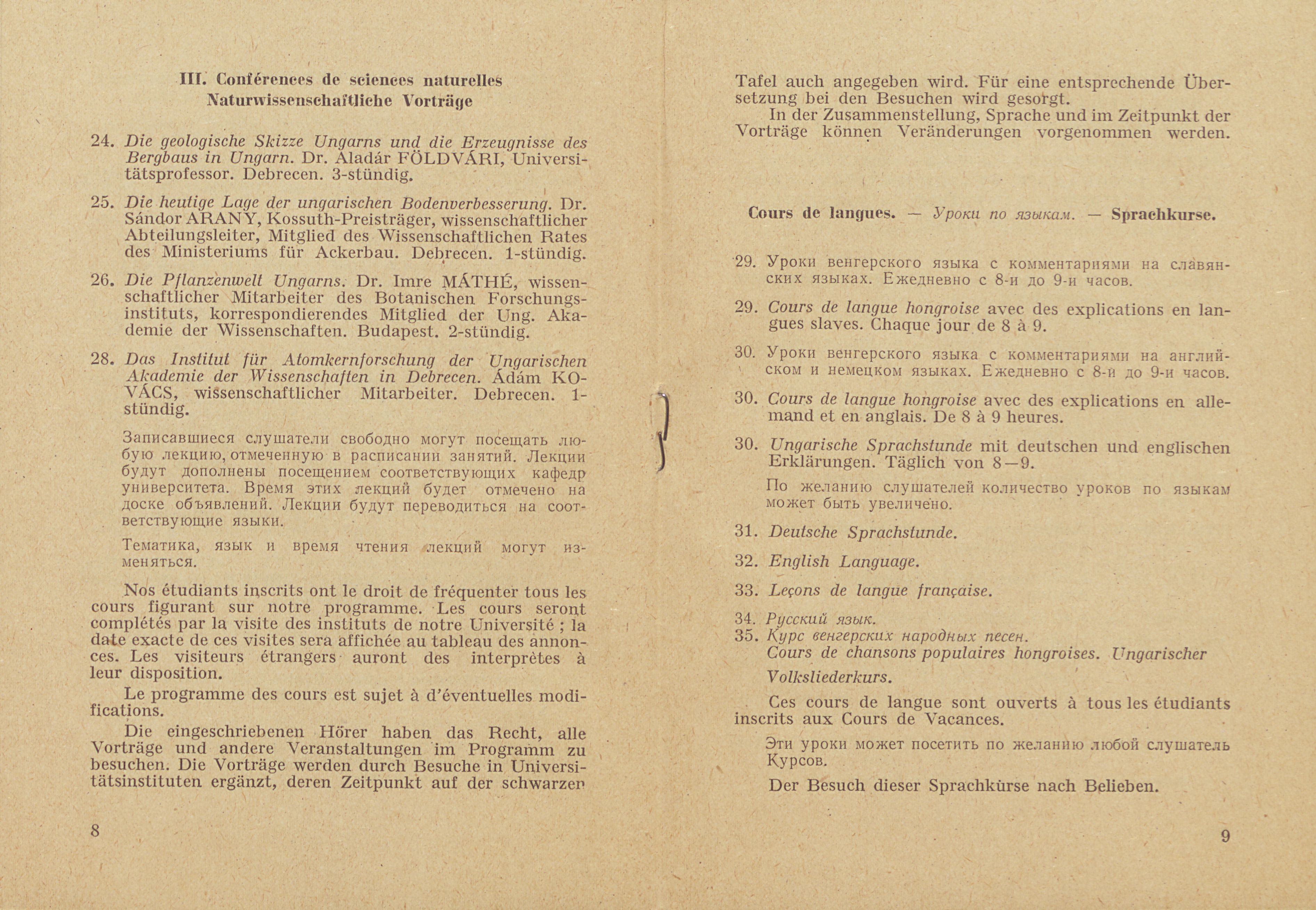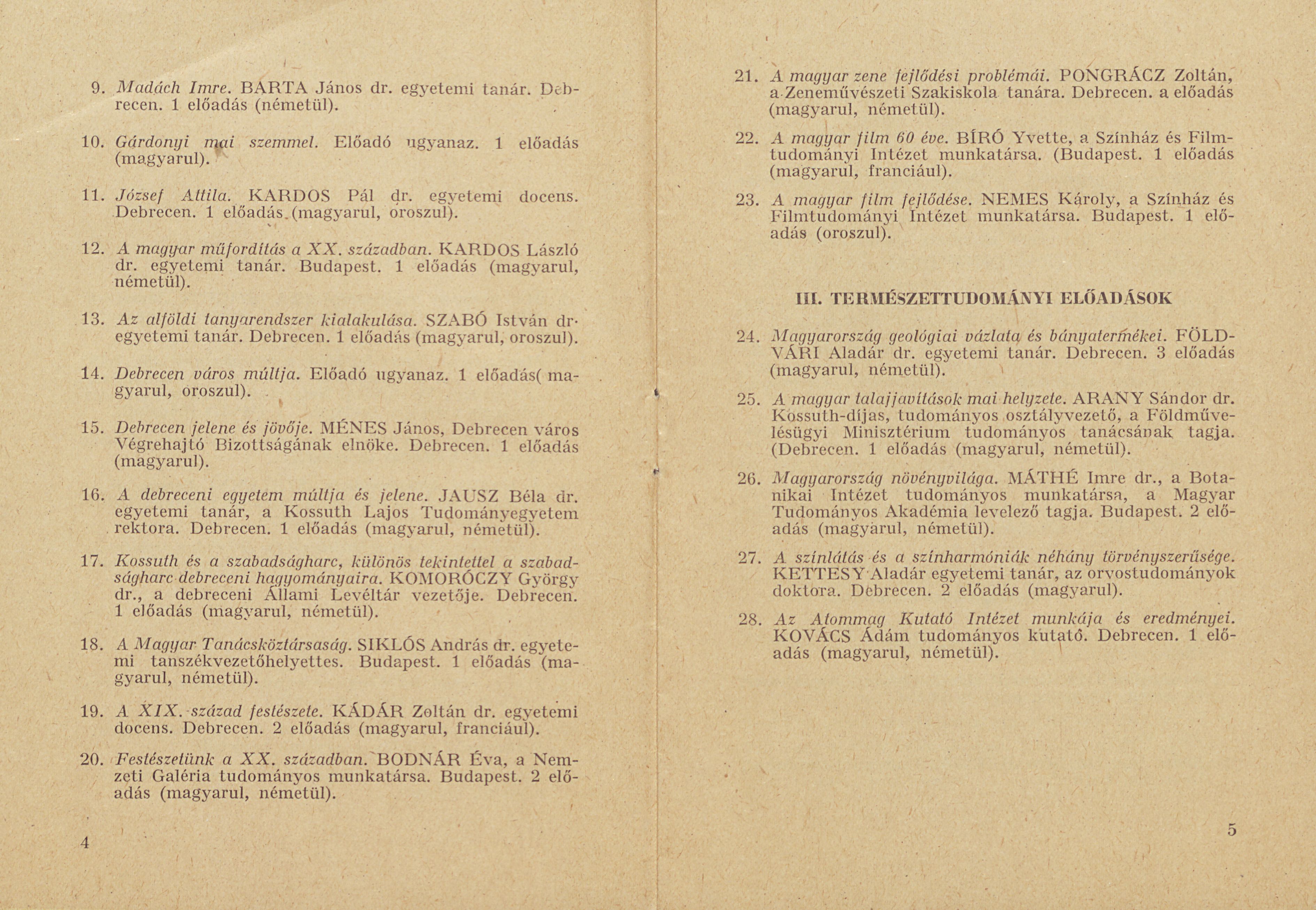 Nyári Egyetem Debrecen 1958 Tanrend