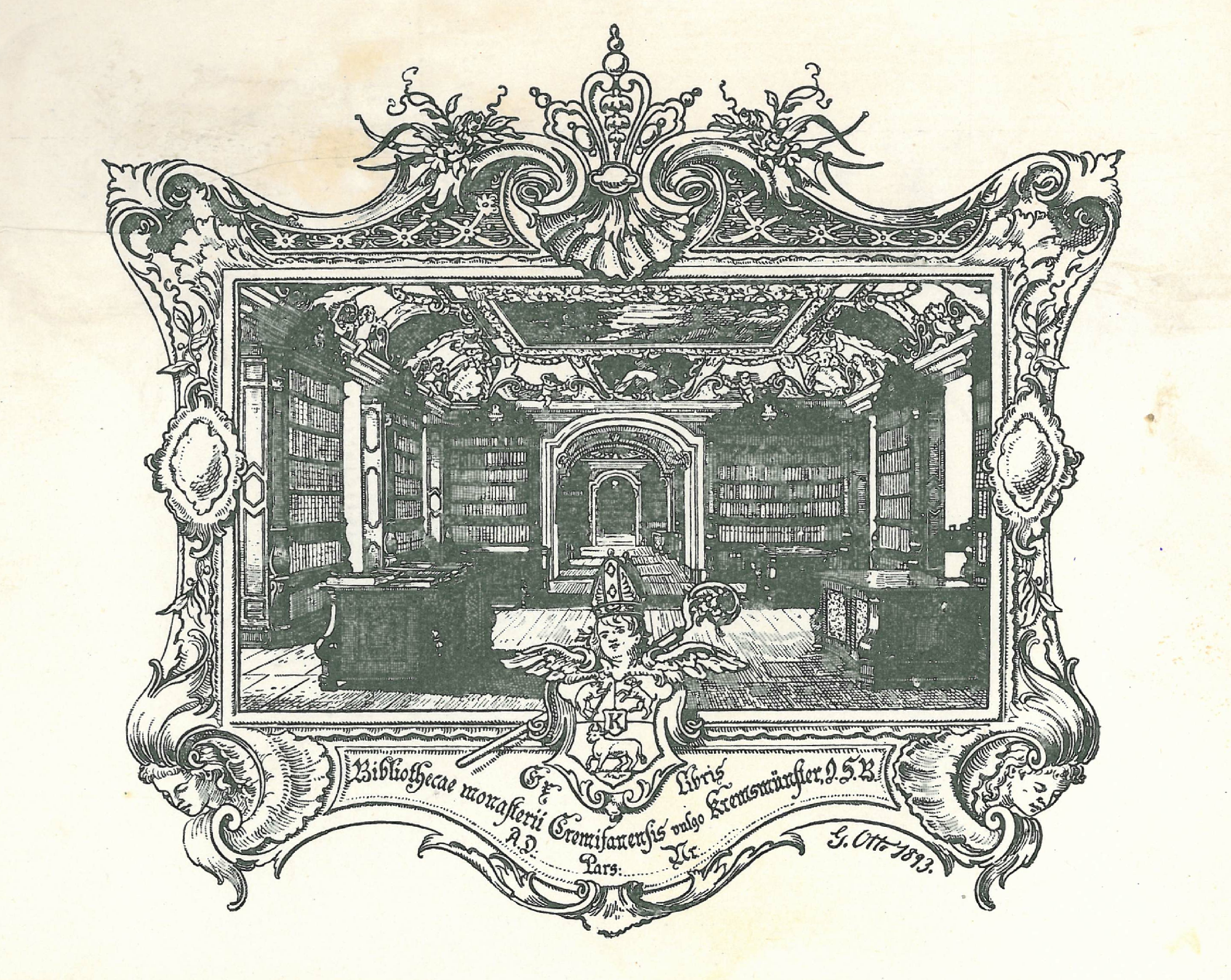 A kremsmünsteri (Ausztria) bencés apátság és kolostor könyvtárának szerzeményezési ex librise.